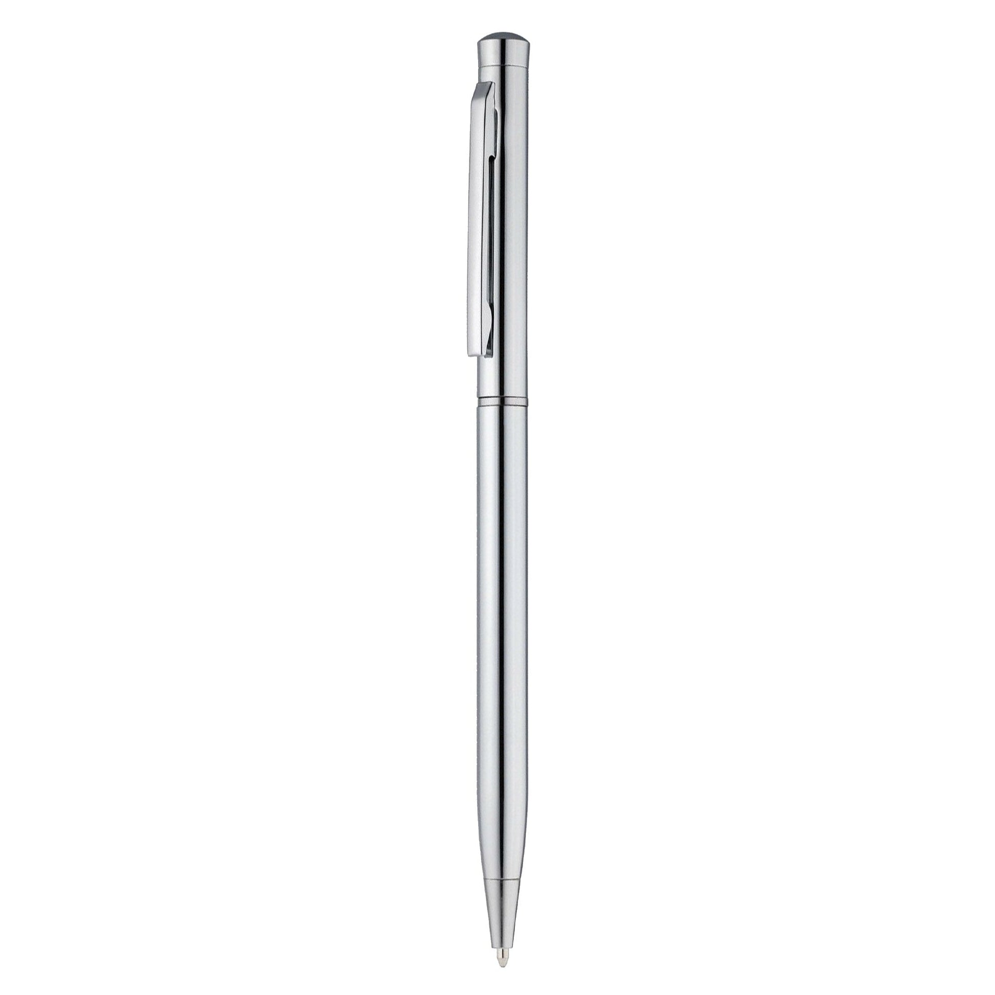 Elegant slim quality stainless steel metal hotel pen with twist action shiny silver chrome barrel a perfect budget metal pen for hotel and motel it has high quality German manufactured black ink refill 1200 meters writing distance tungsten carbide ball provides you with quality writing.