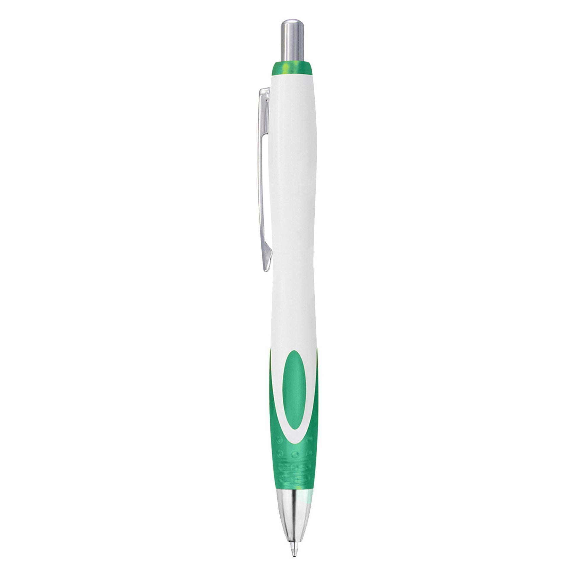 Retractable plastic pen with opaque white barrel and beautiful design of frosted translucent soft-touch grip shiny silver chrome trim. It has high quality German manufactured black ink refill 1800 meters writing distance tungsten carbide ball provides you with quality writing.