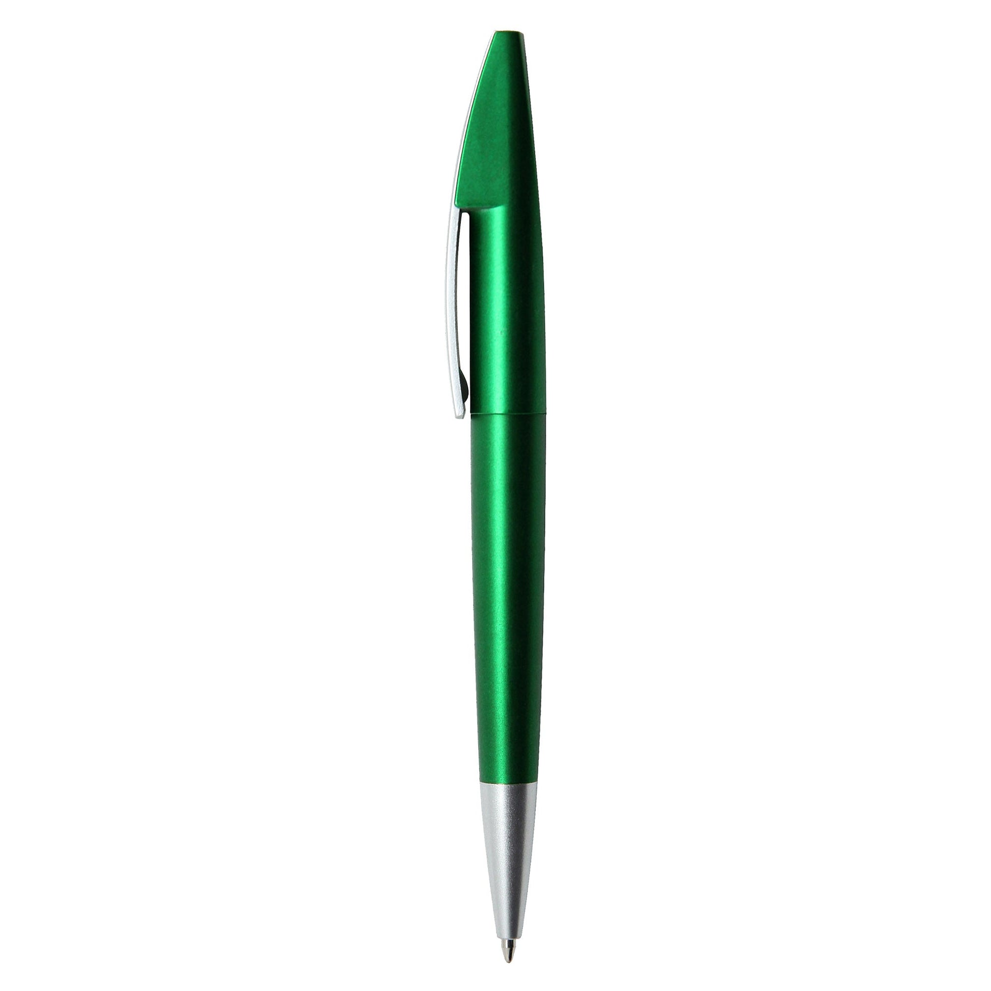 This high-tech looking European style plastic pen with metallic coloured barrel and matt silver chrome clip and tip large printing area on clip twist action with high quality German manufactured black ink refill 1800 meters writing distance tungsten carbide ball provides you with quality writing.